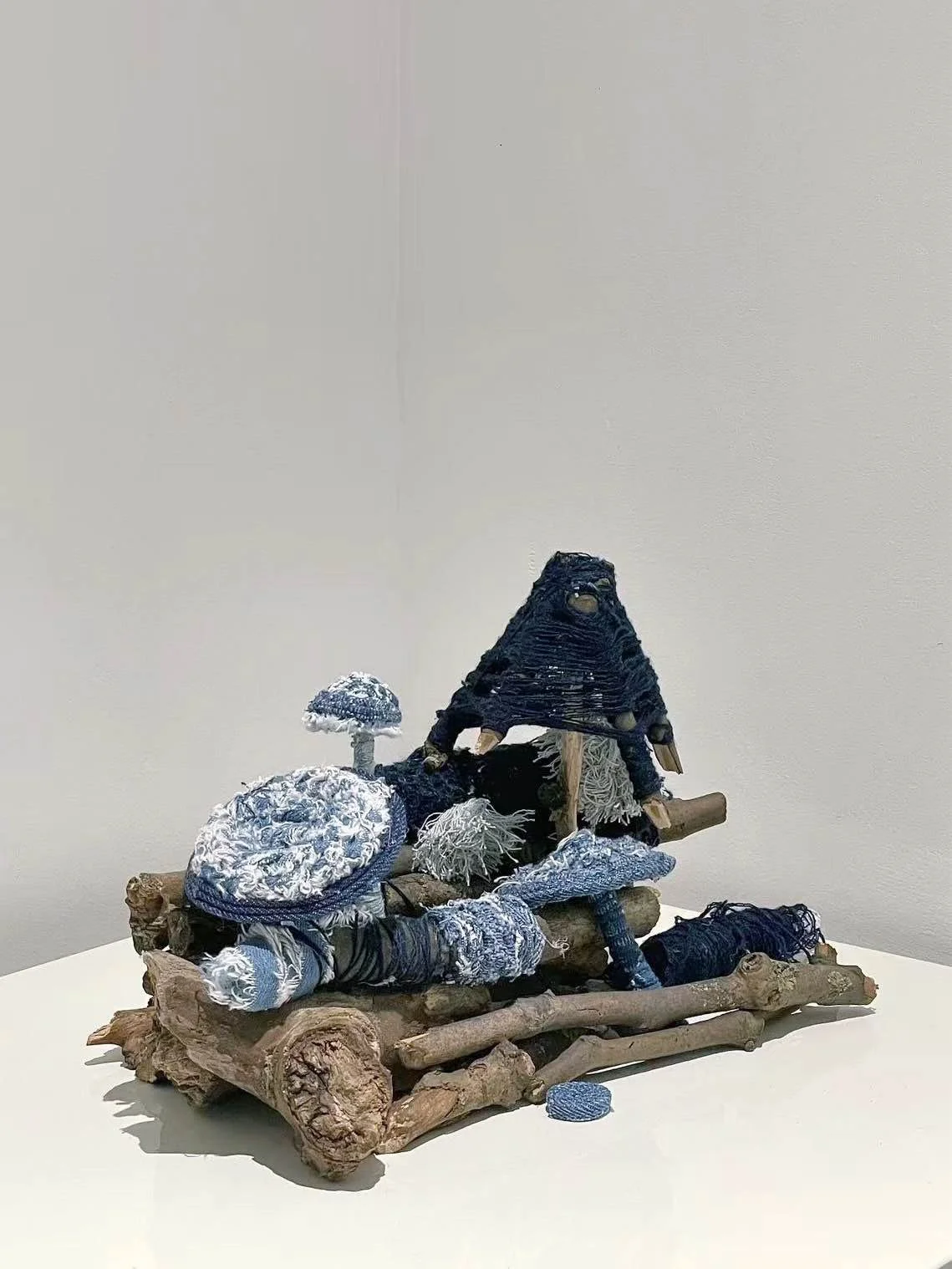 Similarly, Zhang’s memory of her grandmother, who cultivated and wove grasses into household objects, informed her weaving in When Spores Fall— where denim sprouts like fungi from fallen branches, forming structures that hover somewhere between forest floor and bonsai garden. An apt visual metaphor, as fungi feed on what’s discarded, turning decay into growth. Zhang turns what we call waste — materials, time, labour — into art, while holding up consumerism itself as the true rot.