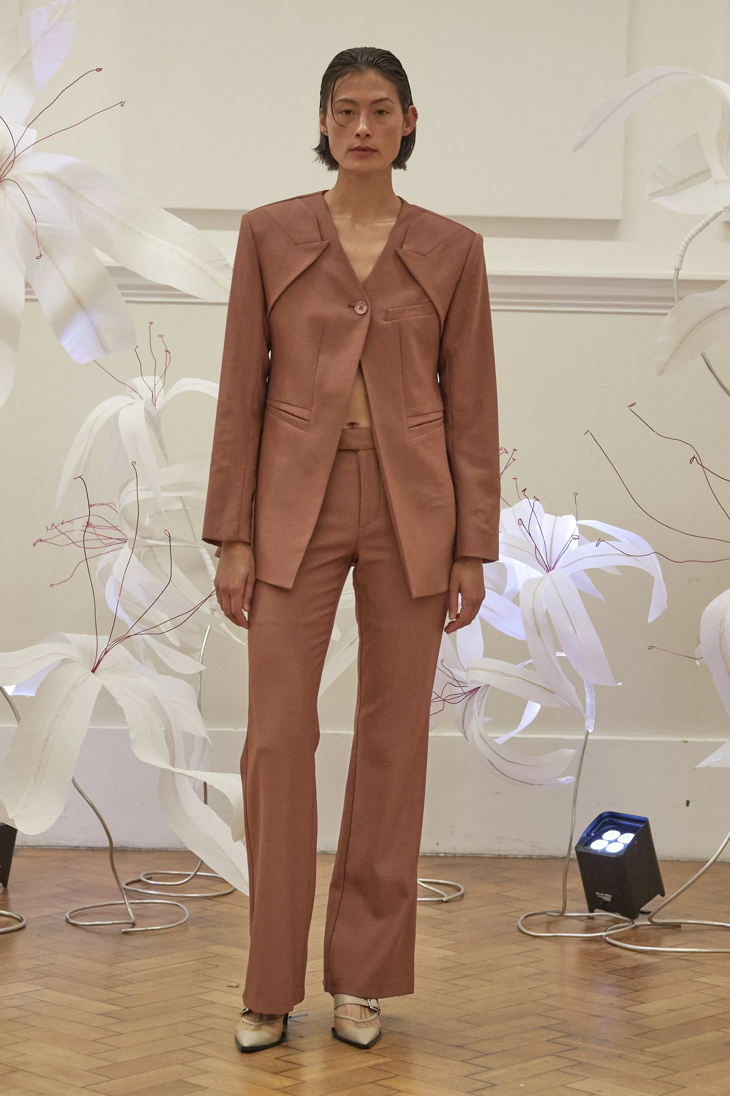 R.C: Details like misaligned blazer lapels and flowerpot-inspired dress silhouettes highlight RAY CHU’s ability to blend practicality with whimsy. The tailored touches, such as the misaligned lapels, add an element of surprise and individuality to otherwise classic garments. Meanwhile, the flowerpot-inspired dresses bring a playful and tender vibe to the collection, offering a sense of joy and creativity without sacrificing wearability.