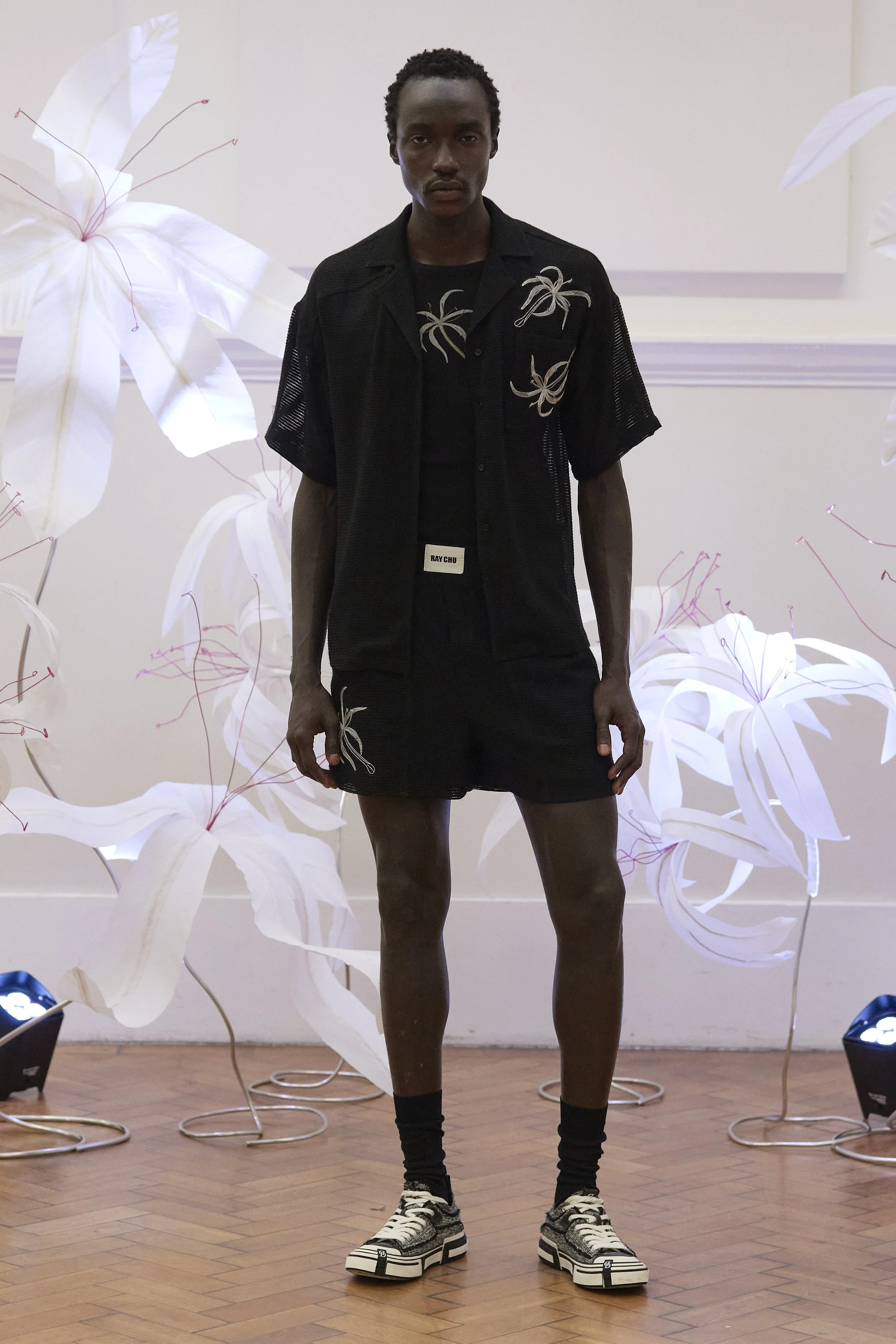 Ray Chu: This season’s design was inspired by the resilience and beauty of drift plants, particularly the Crinum asiaticum flower, which thrives along shorelines. The flower represents wisdom, nobility, and vitality, and it serves as a central motif throughout the collection, reflecting the Taiwanese people’s spirit of resilience and grace. Its distinctive shape and symbolism are incorporated into the 3D-printed elements, graphic printing and the cut in suits.