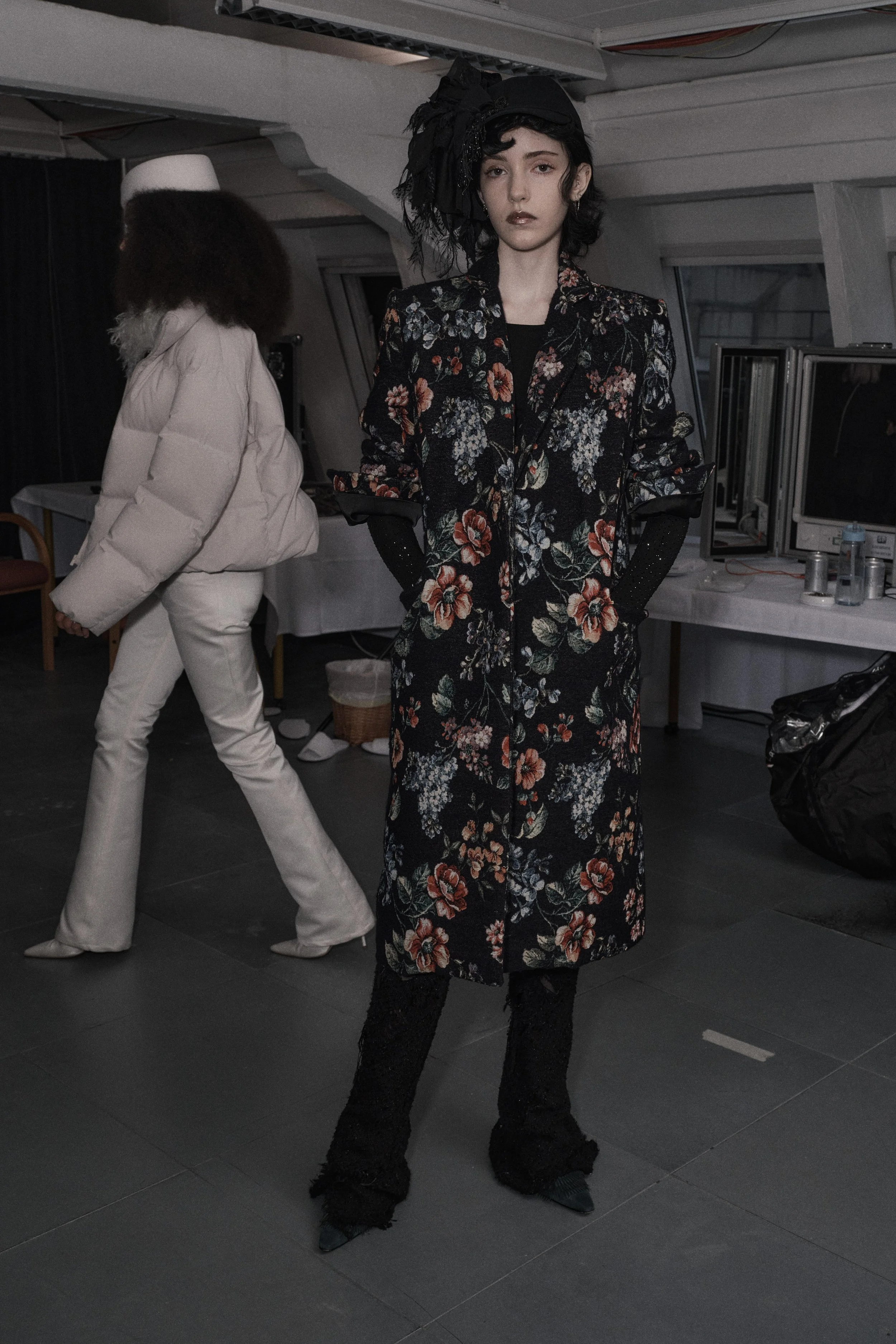 Shimmer arrived in modest mid-calf shift dress entirely sequinned, refracting in sparkle beneath the presentation’s scrutiny. Specks of blush and leaf push through the dense silver armour as romantic Pre-Raphaelite locks fall over. Velvet capris elongate the silhouette, crowned by an inflated boatneck frame of panelled pleating. Metallic oil-slick sequin eyeliner and icy-blue waterlines hardened gazes of Fagerström’s iterations of the coaching mother. Corn-based faux fur trims and sculpted fleece jackets- nipped hyperbolically at the waist- balanced glamour with maturity. Not a six-inch stiletto in sight, kitten heels anchored every look in pragmatism.
