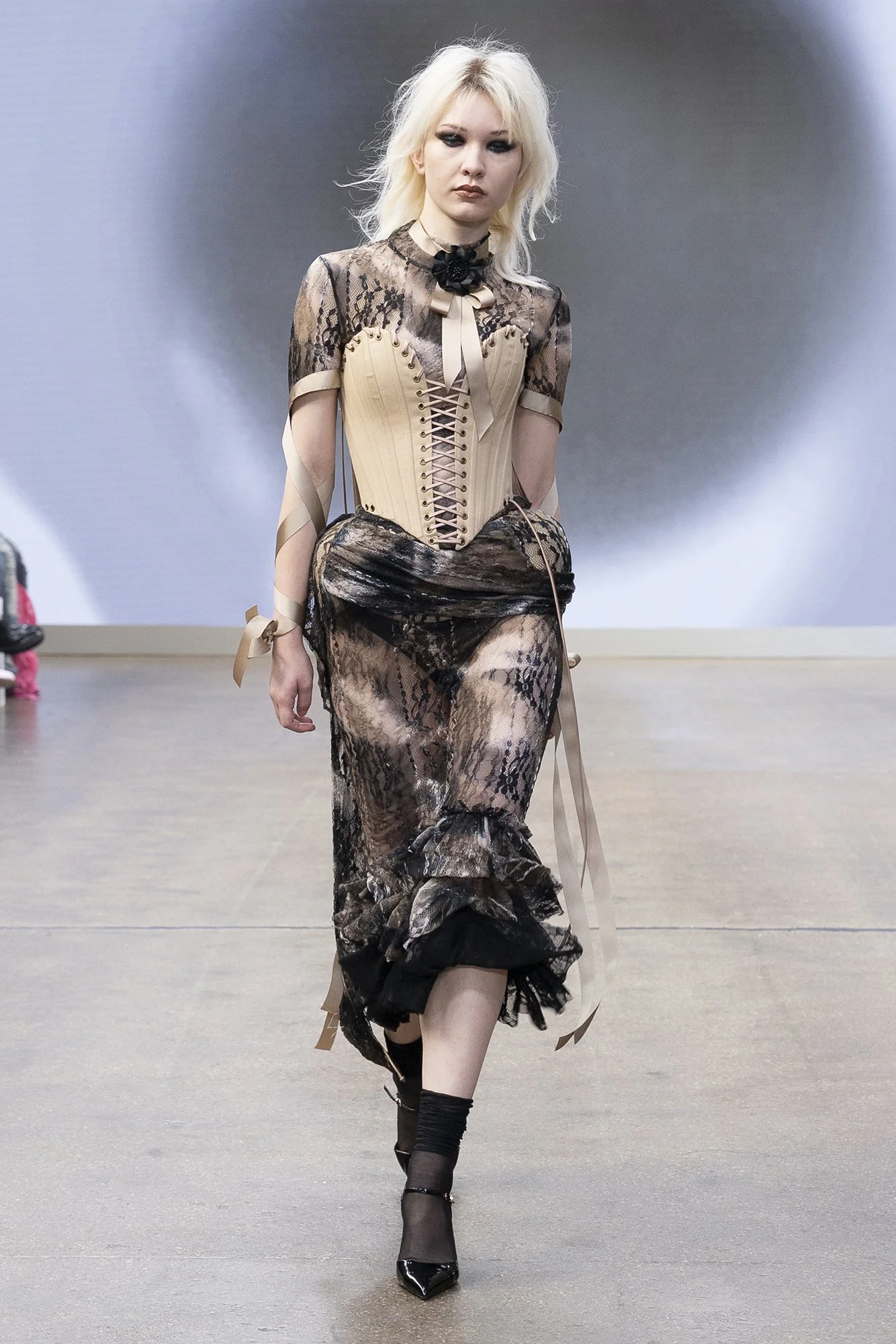 Agro’s SS26 felt to me like a staged debate. Clothes exploring the tension between severity and softness. Utilitarian grit vs. ballroom flourish. It asks whether a woman in a corset is constrained or commanding, and whether a man in shearling is shielding himself or simply playing dress-up with power.