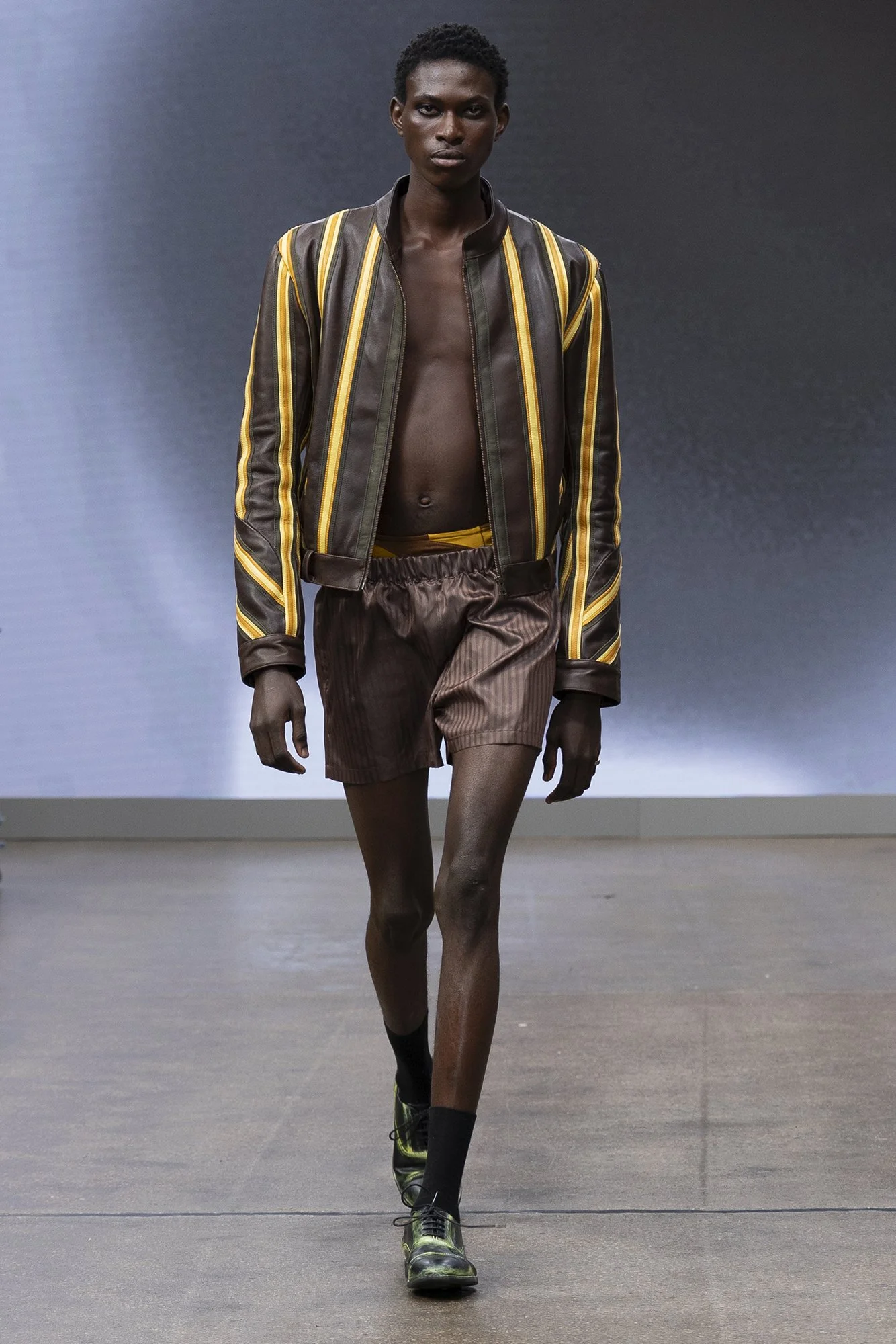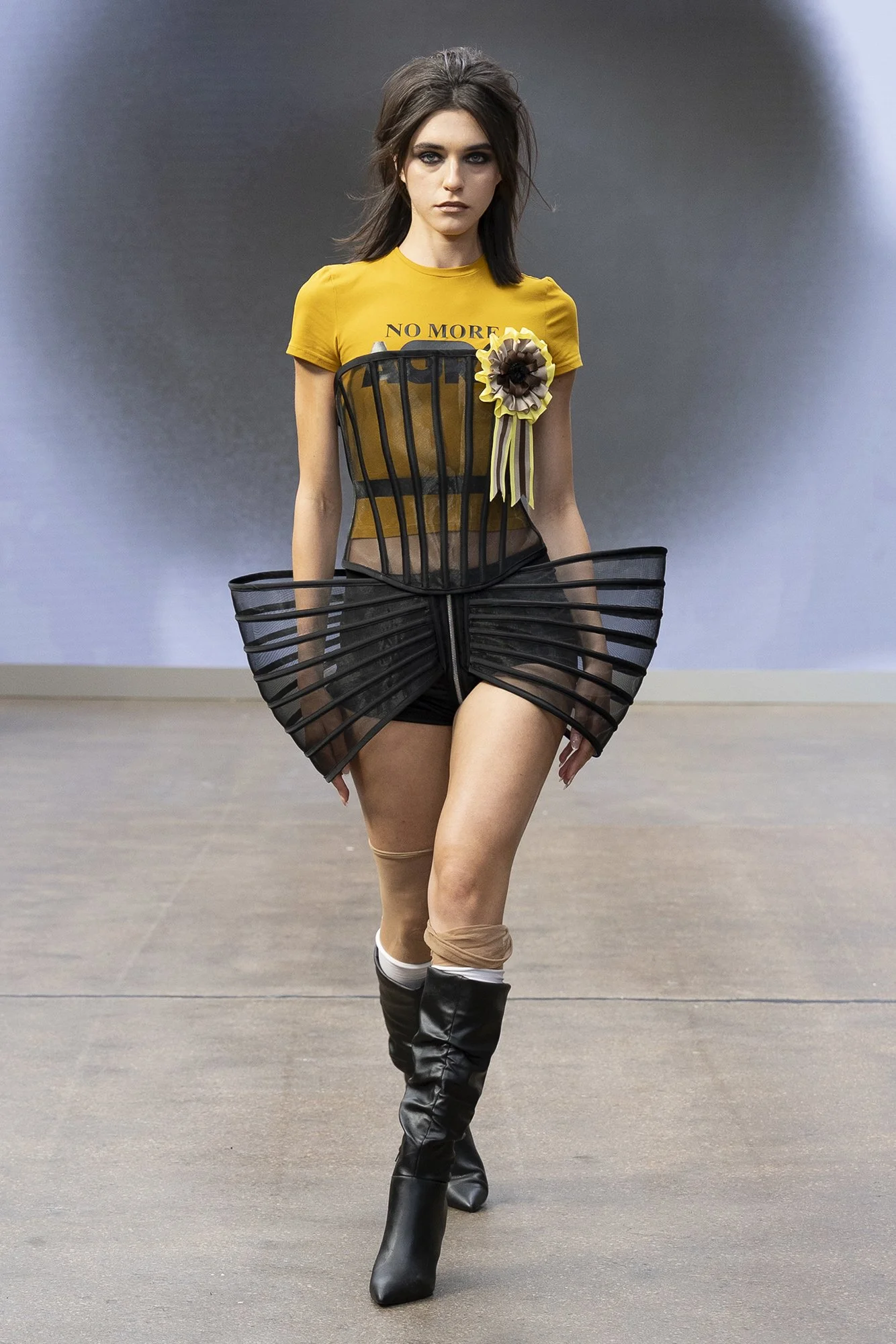 The mood swung with the next parade of looks. A shearling bomber made from cracked-patch leather panels, “NO MORE AGRO” blazoned across the chest in a manifesto yellow. It was a wink and a warning. An assertion that the collection was both about conflict and its refusal. The message read as a call for gentler strength, wrapped in clothes that looked built to weather both storms and trials.