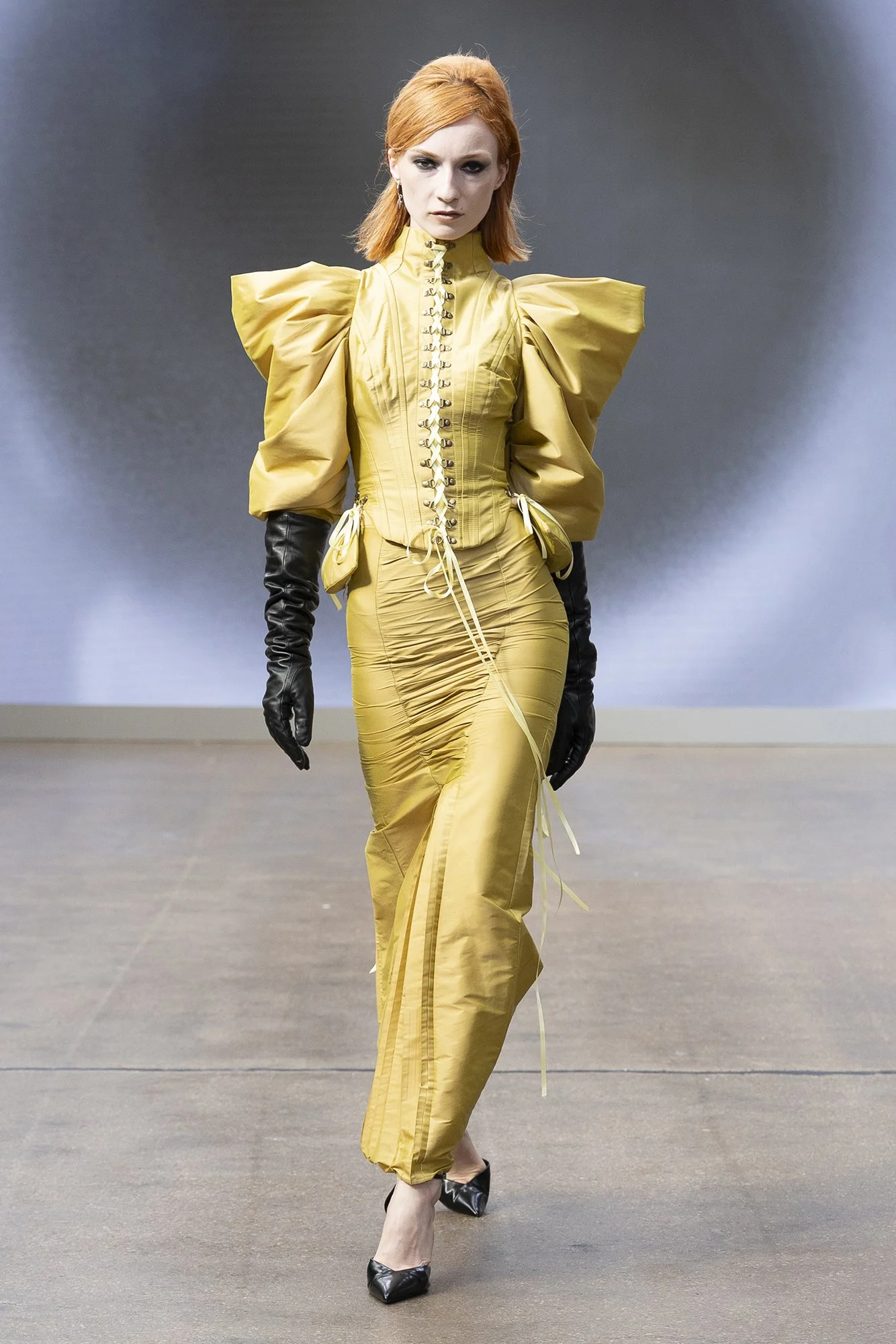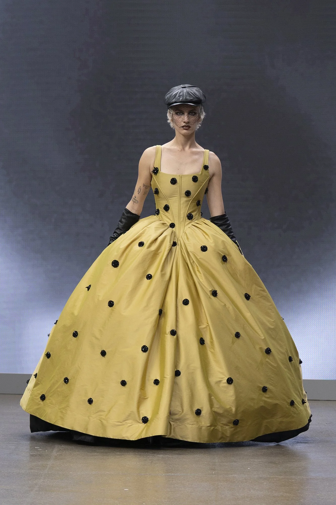 Agro Studios’ Spring Summer 2026 show walked the line between the tradition of ceremony and the rebellion of modern structural design, like a procession through a future court that had outlawed boredom. The collection unfolded in bright hues, saffron, chartreuse, sky-blue satin, and the sharp black of lacquered leather. The opening look, a golden gown cinched and corseted into submission felt like a suit of armor disguised as desire. Its puffed sleeves announced the model's presence before their footsteps could; the lacing down the torso pulled the viewer forward, as though the garment itself demanded confrontation.