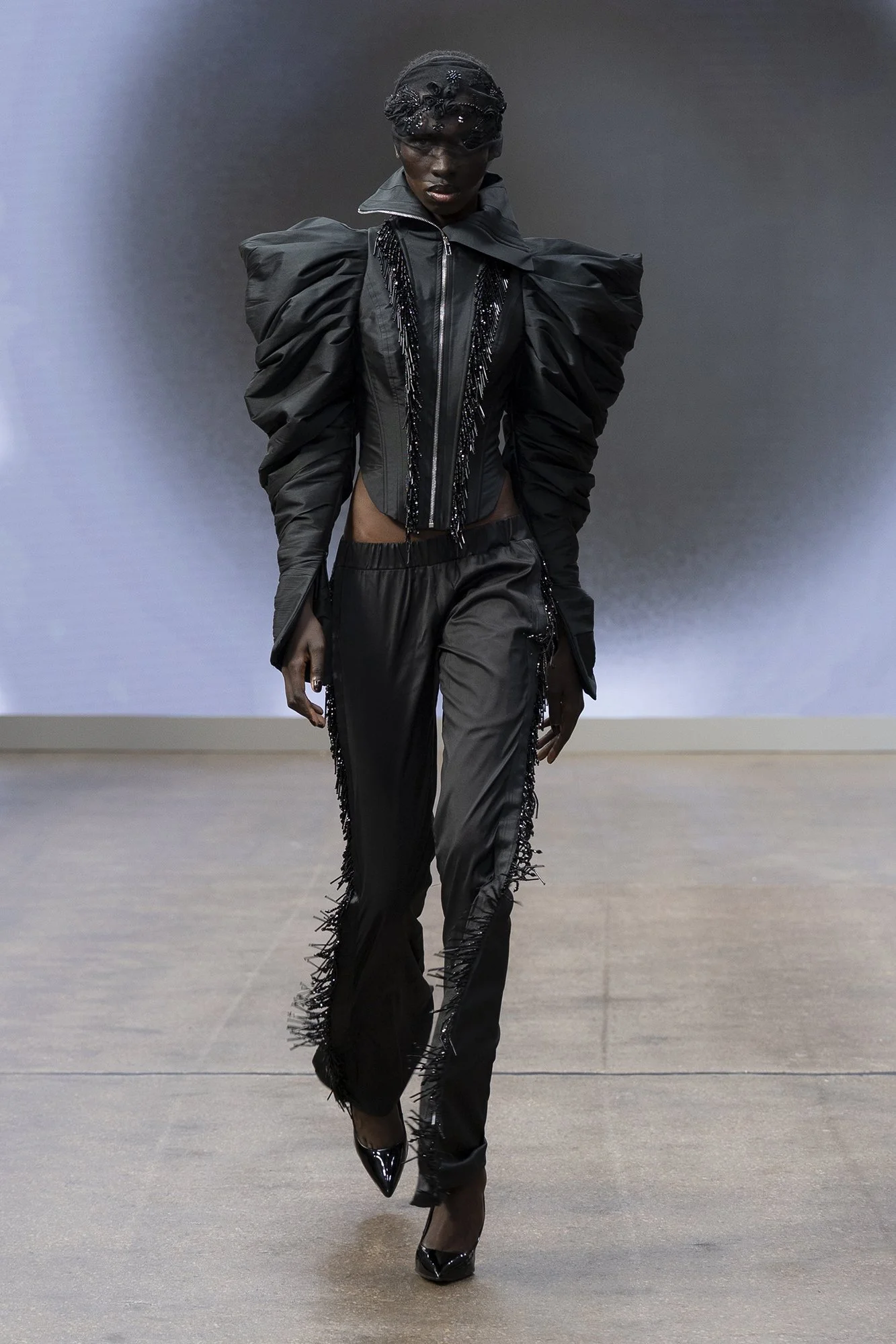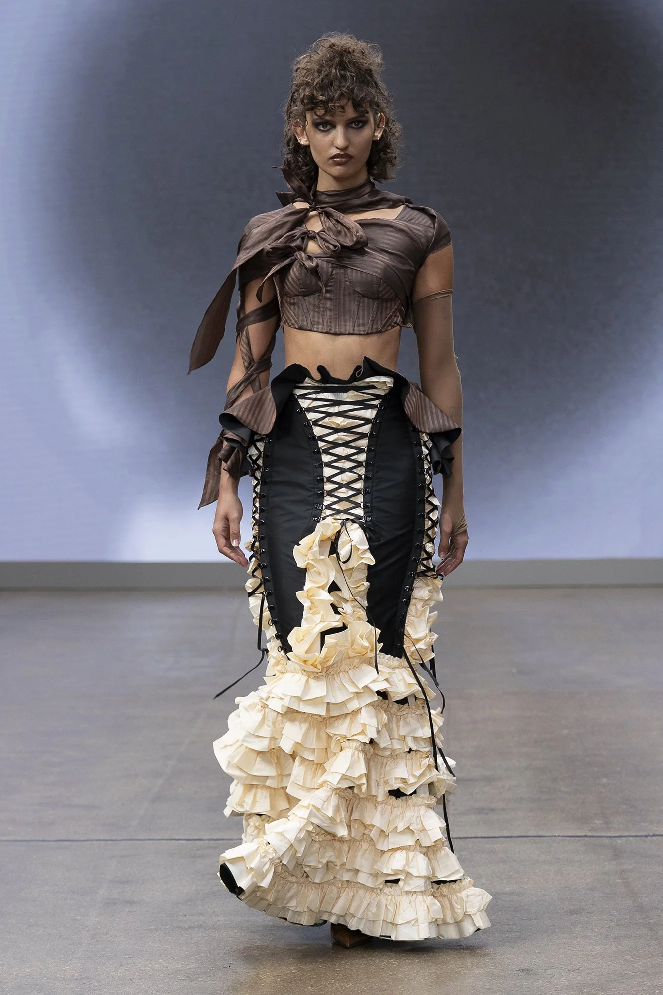 Each garment carried the refusal to be only one thing. What Agro offered this season was not comfort, but a kind of liberation through tension: a wardrobe that clenches its jaw and then smiles anyway. The runway closed not with a bow but a charge, an invitation to wear your armour, your satin, your stripes, all at once, and to let them argue on your body.