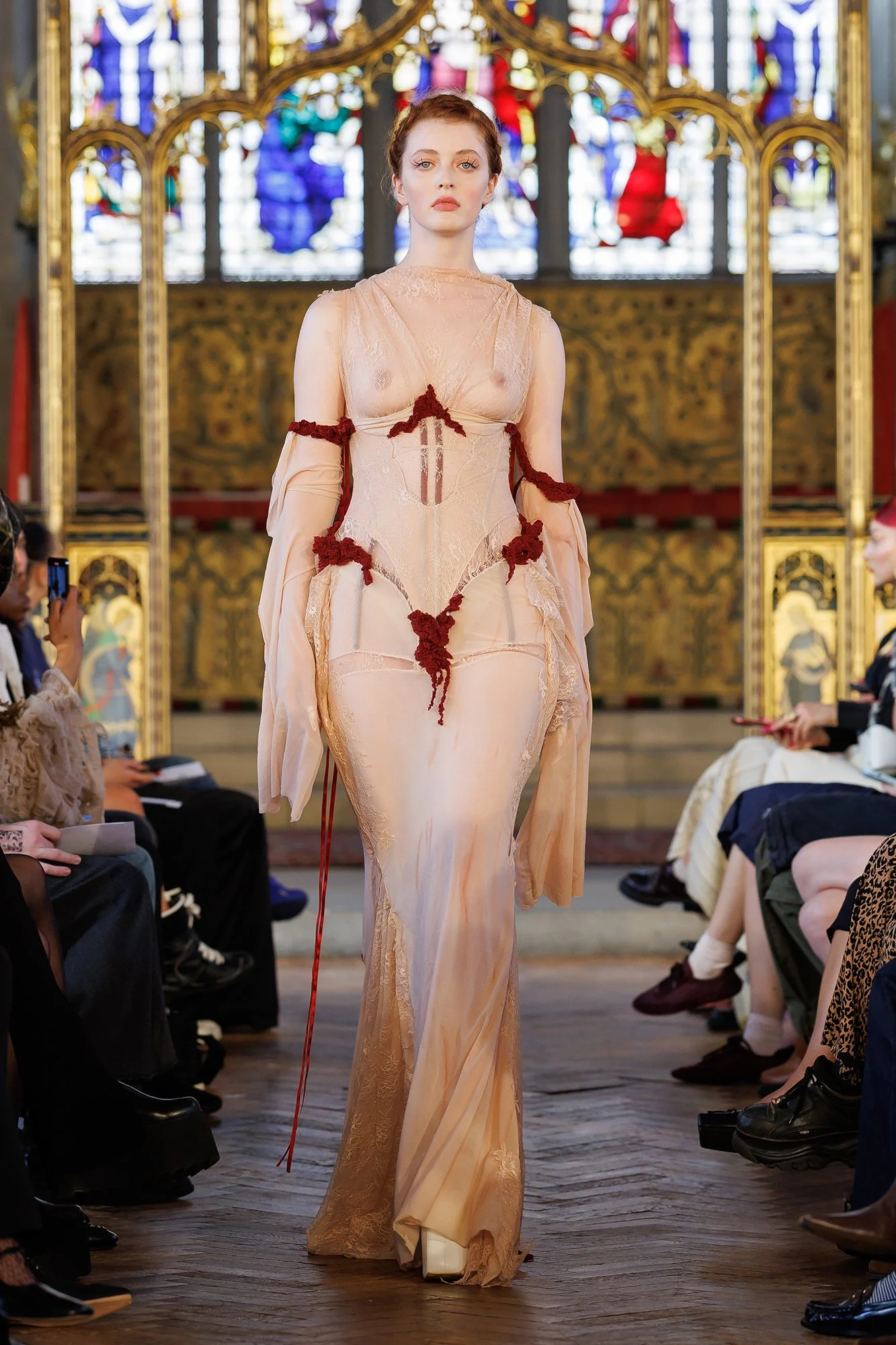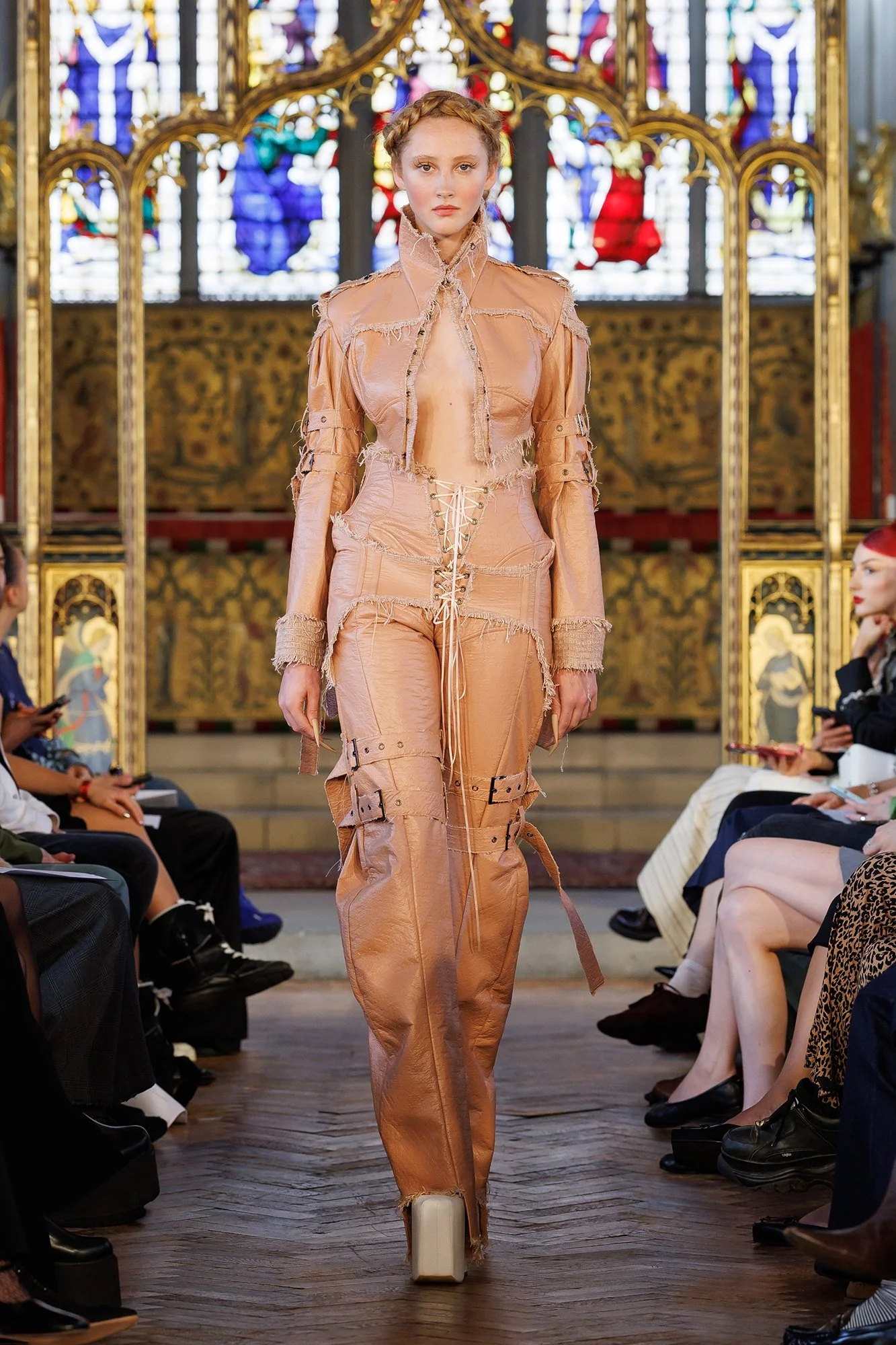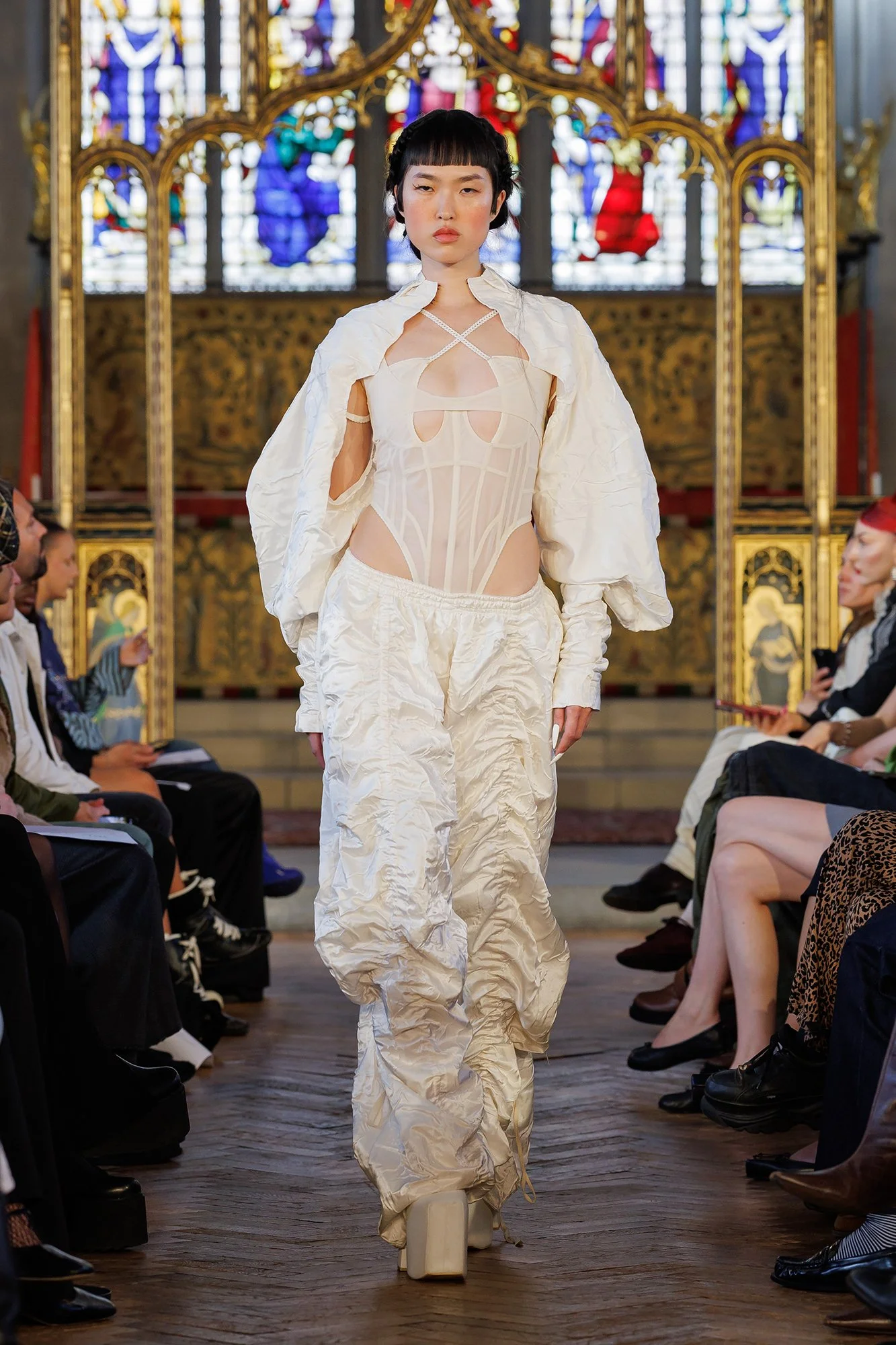 In St Cryptian's Church, models walk slowly; confident and intentional. This is a place of worship, where the deliberate pace of movement allows us time to appreciate the garments in all their glory. Full-length dresses exude sensuality, with sheer and lace fabric adorning as it reveals. We also see a prominent motif of ribbon, in a criss-cross pattern over bare skin, running along the front of trousers and the entire length of the back of dresses. I’m reminded of stitches and scars. I think of endurance, and the strength it takes to be so soft.
