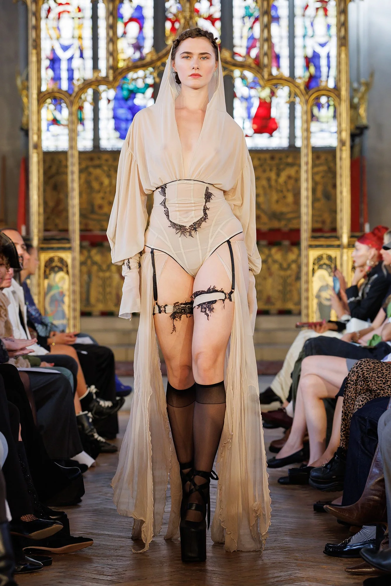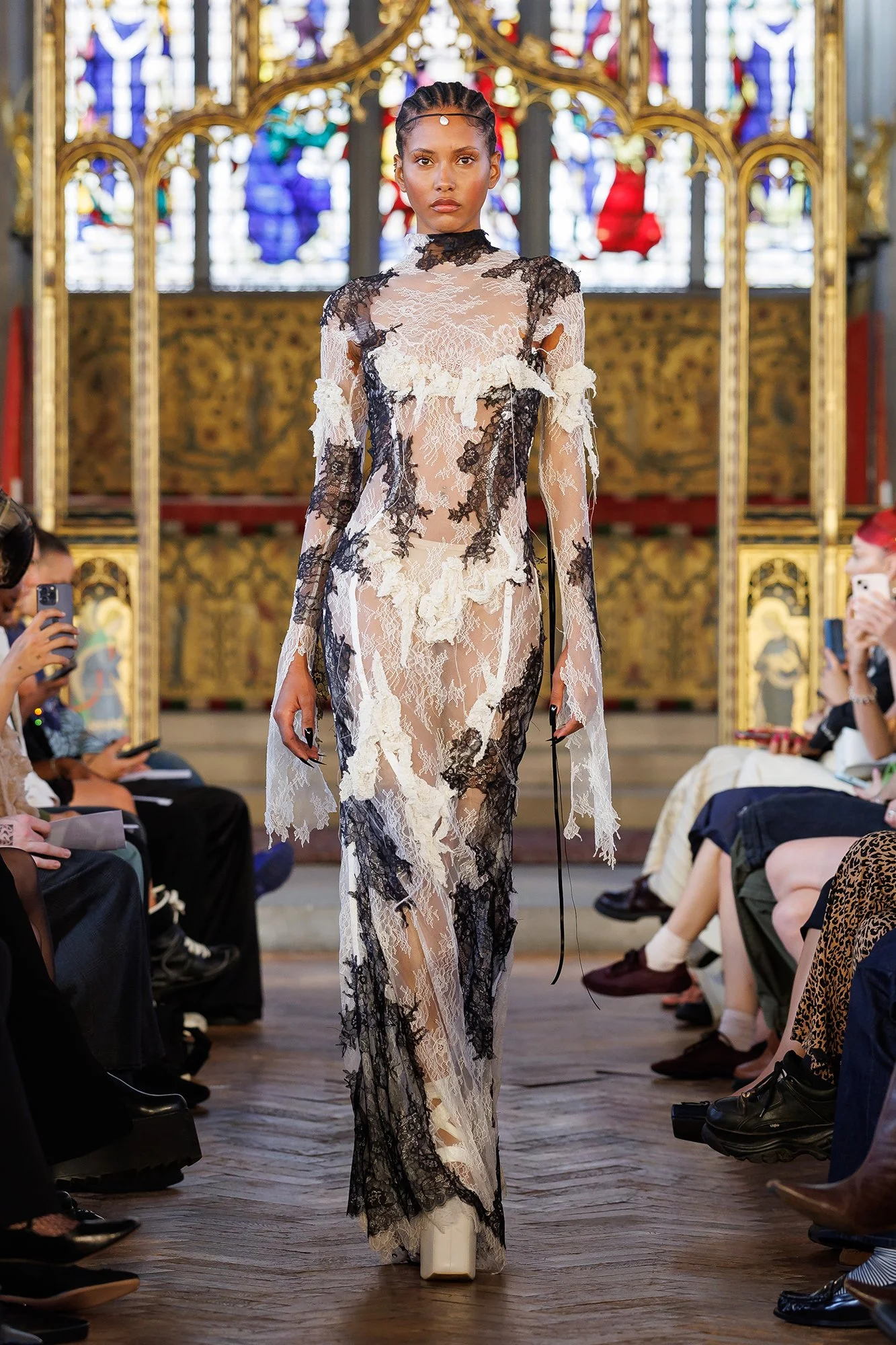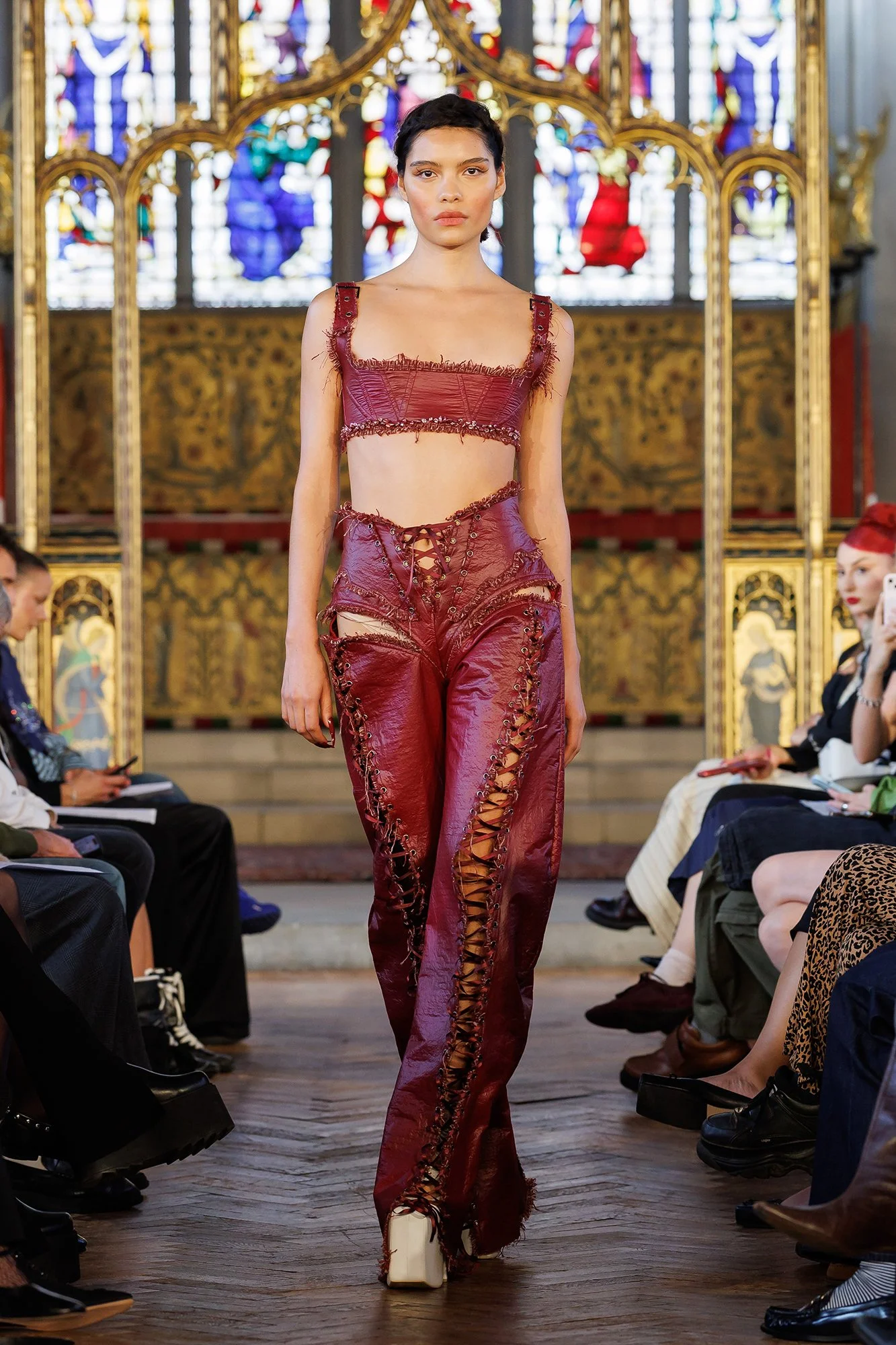 In St Cryptian's Church, models walk slowly; confident and intentional. This is a place of worship, where the deliberate pace of movement allows us time to appreciate the garments in all their glory. Full-length dresses exude sensuality, with sheer and lace fabric adorning as it reveals. We also see a prominent motif of ribbon, in a criss-cross pattern over bare skin, running along the front of trousers and the entire length of the back of dresses. I’m reminded of stitches and scars. I think of endurance, and the strength it takes to be so soft.