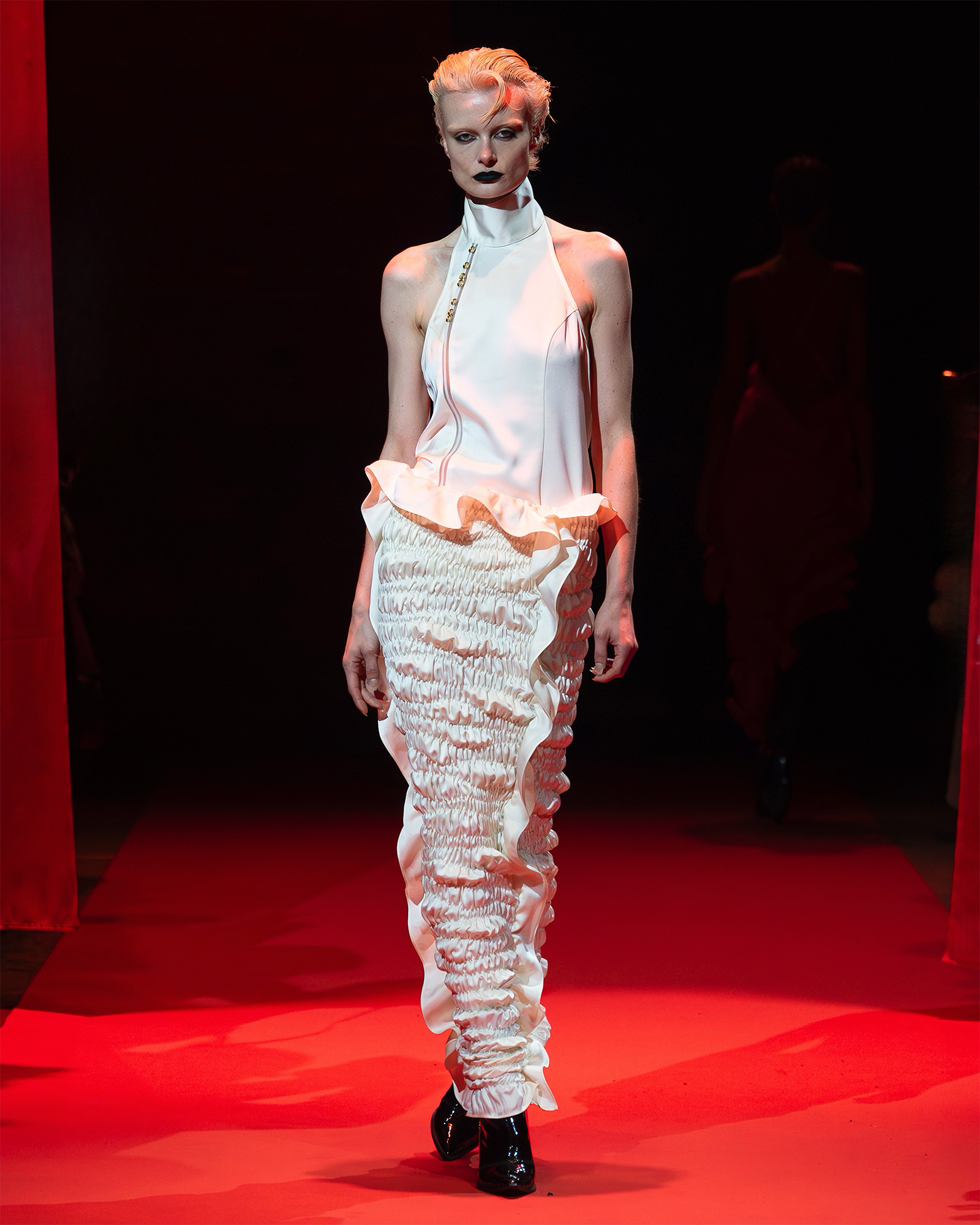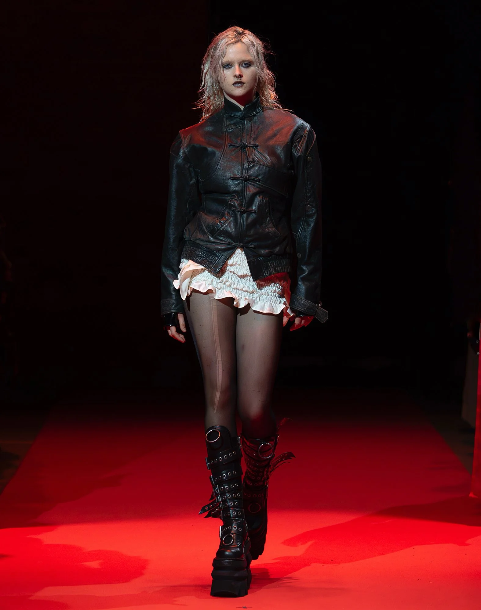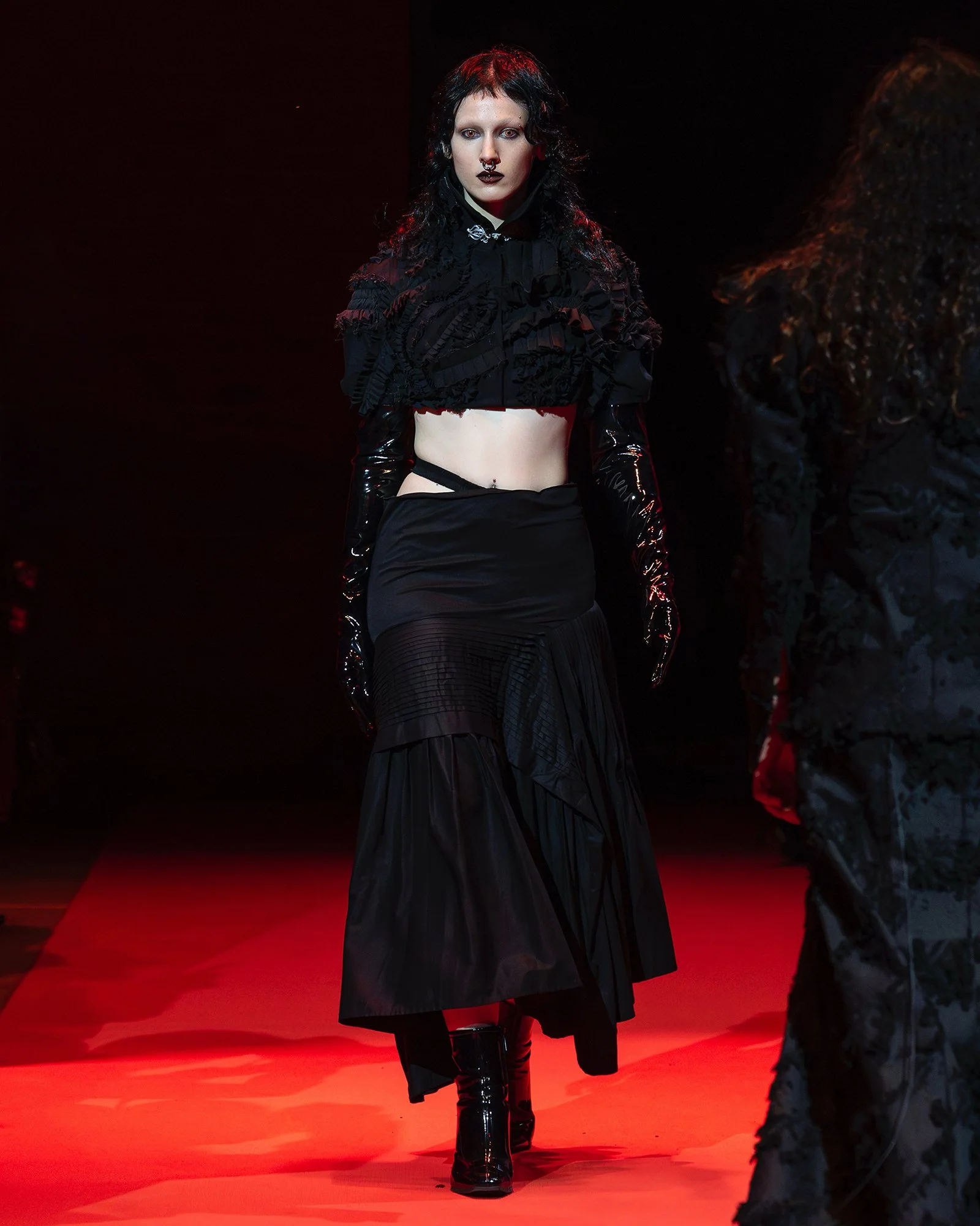 This season, Lee doubled down on her rebellious codes of punk romanticism, deconstruction, and unapologetic sensuality. There was a striking play between structure and fluidity in this collection: a cropped white shirt, ballooned at the sleeves, was paired with a scarlet, ruffled mini skirt layered over black trousers to create an almost militant silhouette softened by its playful proportion. Beside it, a long, blood-red halter dress hung with monastic restraint. It's high neckline was closed with ties that felt both austere and erotic.