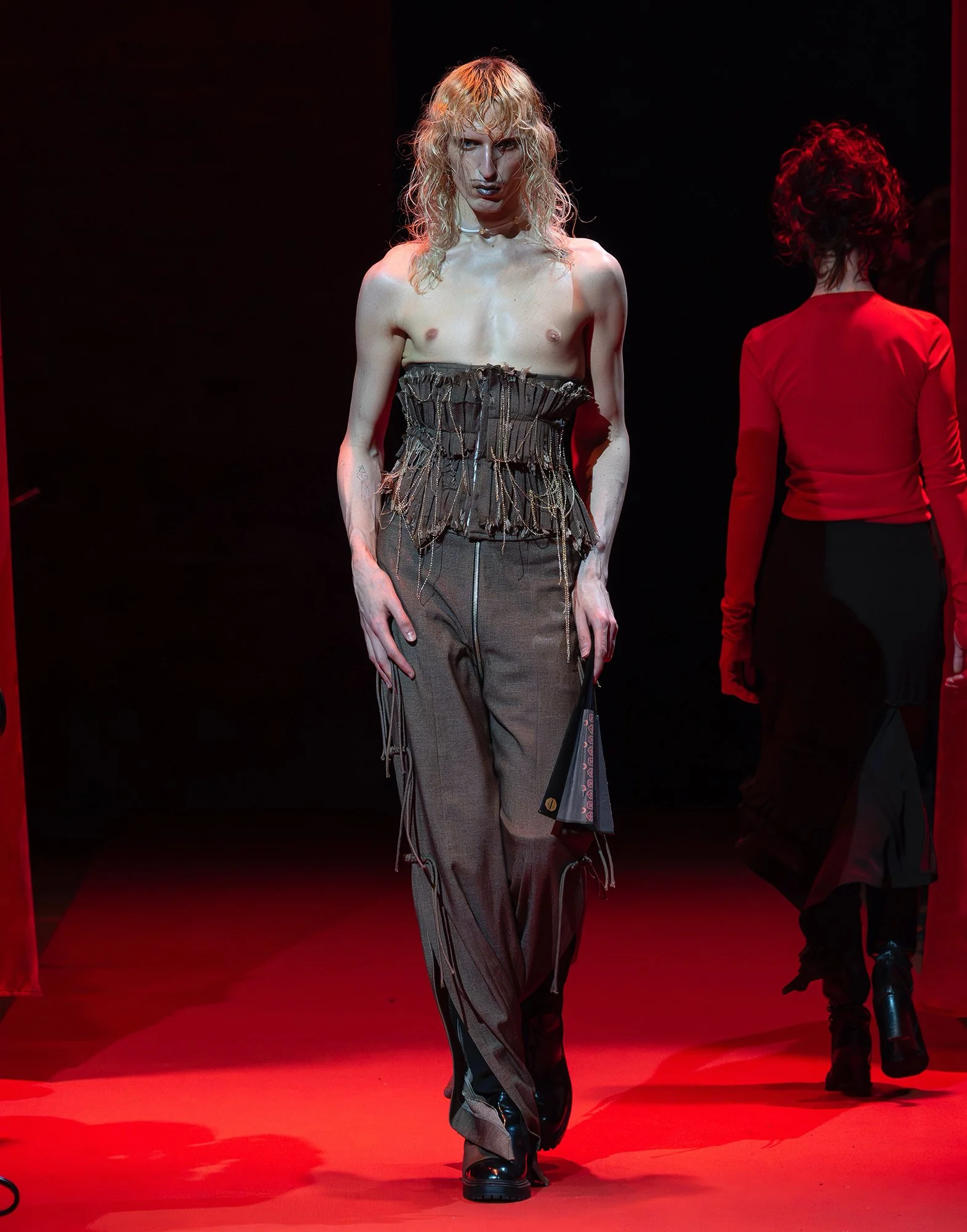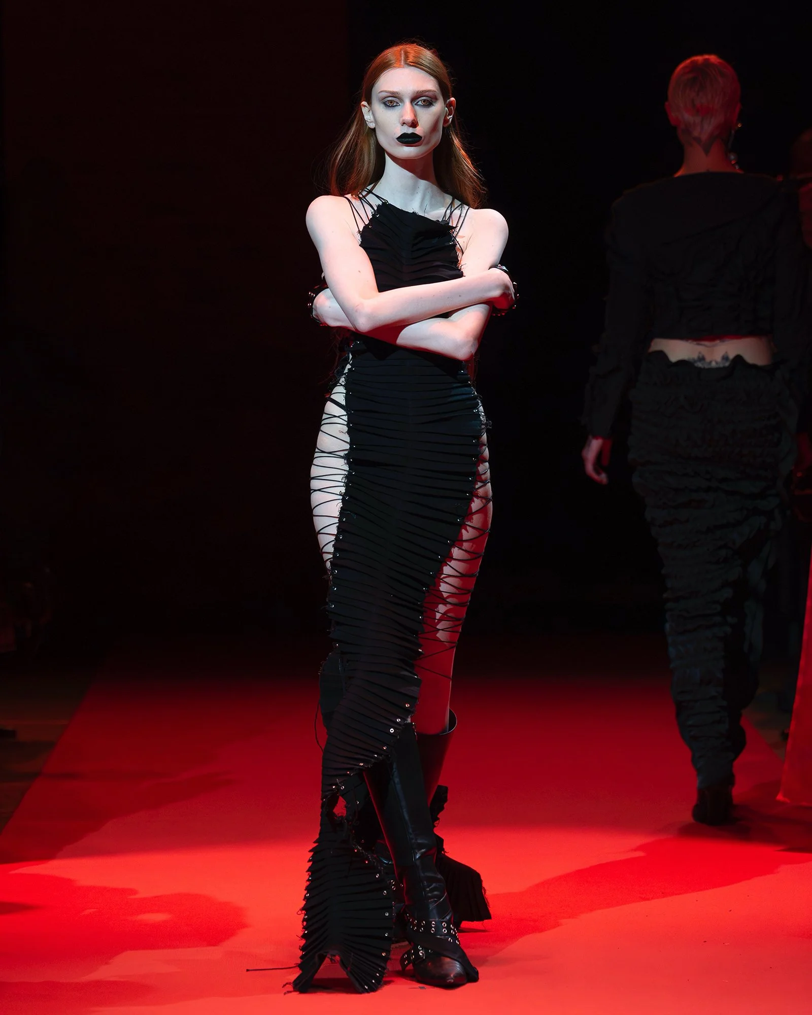 Throughout this sharp and theatrical presentation, texture was everywhere. One standout look featured a corset-like bodice built from what looked like distressed leather strips, wrapped around the torso with a raw, bark-like quality. It read like armour primal yet delicate, evoking a sense of both survival and transformation. The collection’s darker pieces were equally potent: slinky black dresses clung and draped around the body with a shadowy seduction, punctuated by sharp chokers and thigh-high platform boots that elevated the mood into gothic futurism.