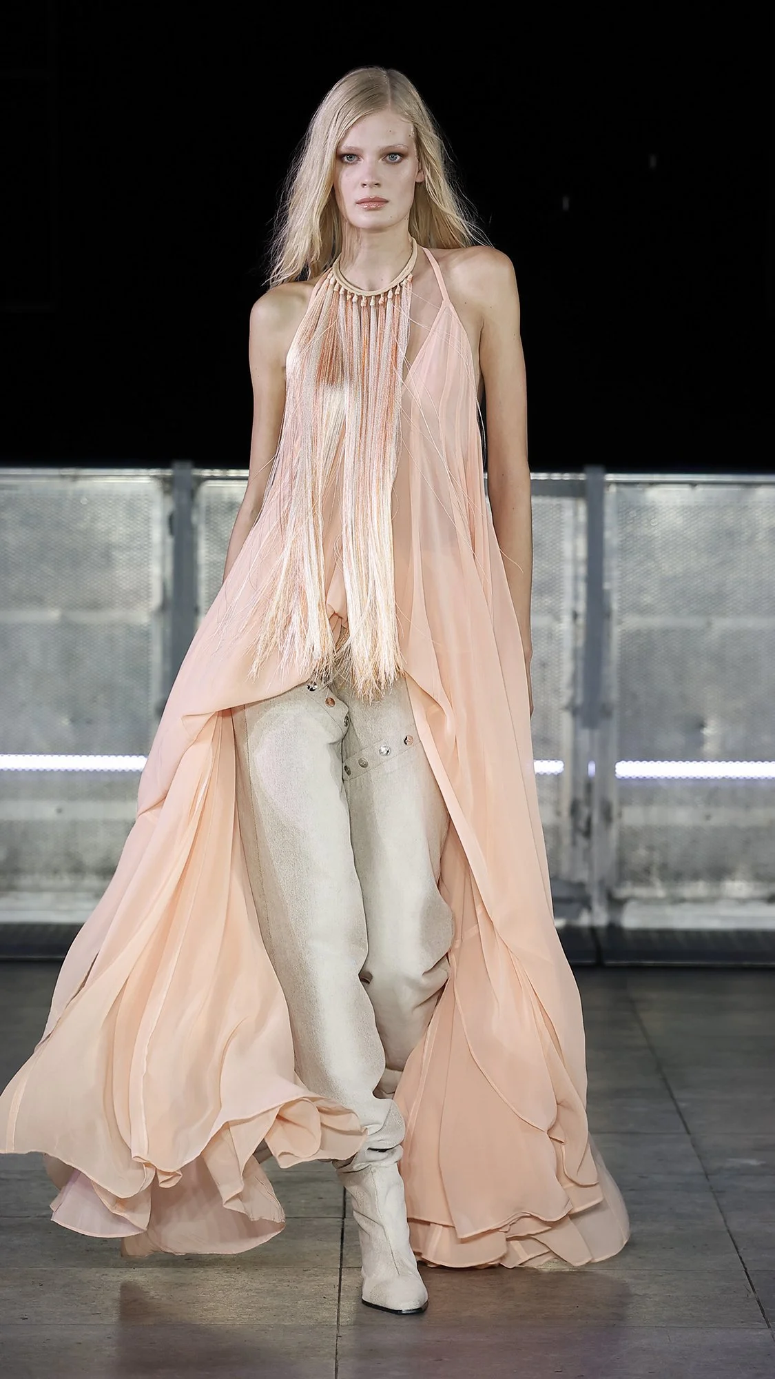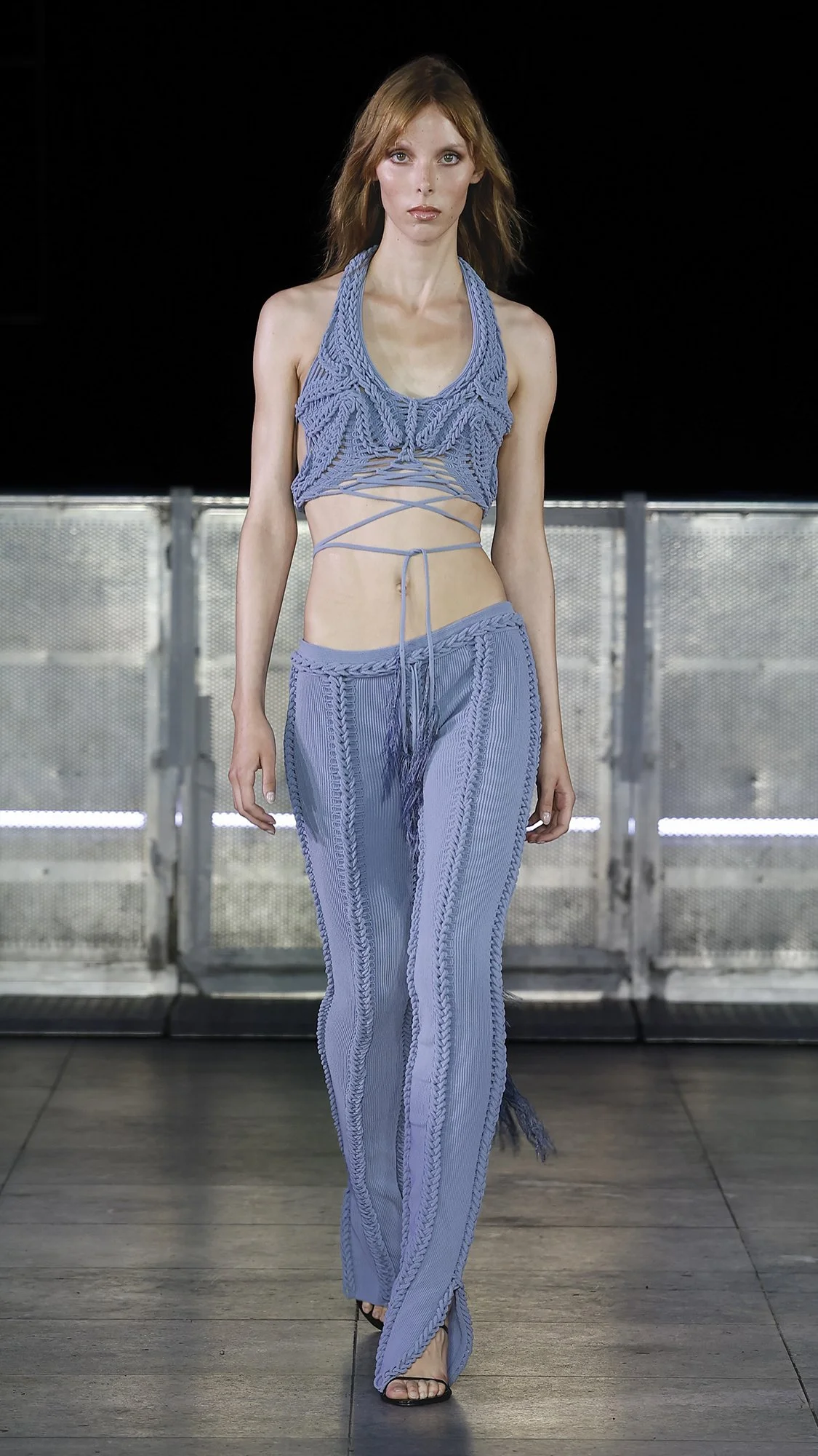 Fast cites particular inspiration in sea glass— debris that time and the tide transform into something desirable. This principle of metamorphosis guides the collection. Thick braided knit, that recalls sailing ropes and fishing nets, is molded into sensual dresses, skirts and tops that contour the body. Here, skilled craftsmanship and intentional yarn selection transforms what in other hands might be weighty and utilitarian into sculptural elegance. Varying textures also add further dimension to these looks. Fringe detailing moves hypnotically as the models walk, and cascading chiffon ripples on the runway, fluid as water.