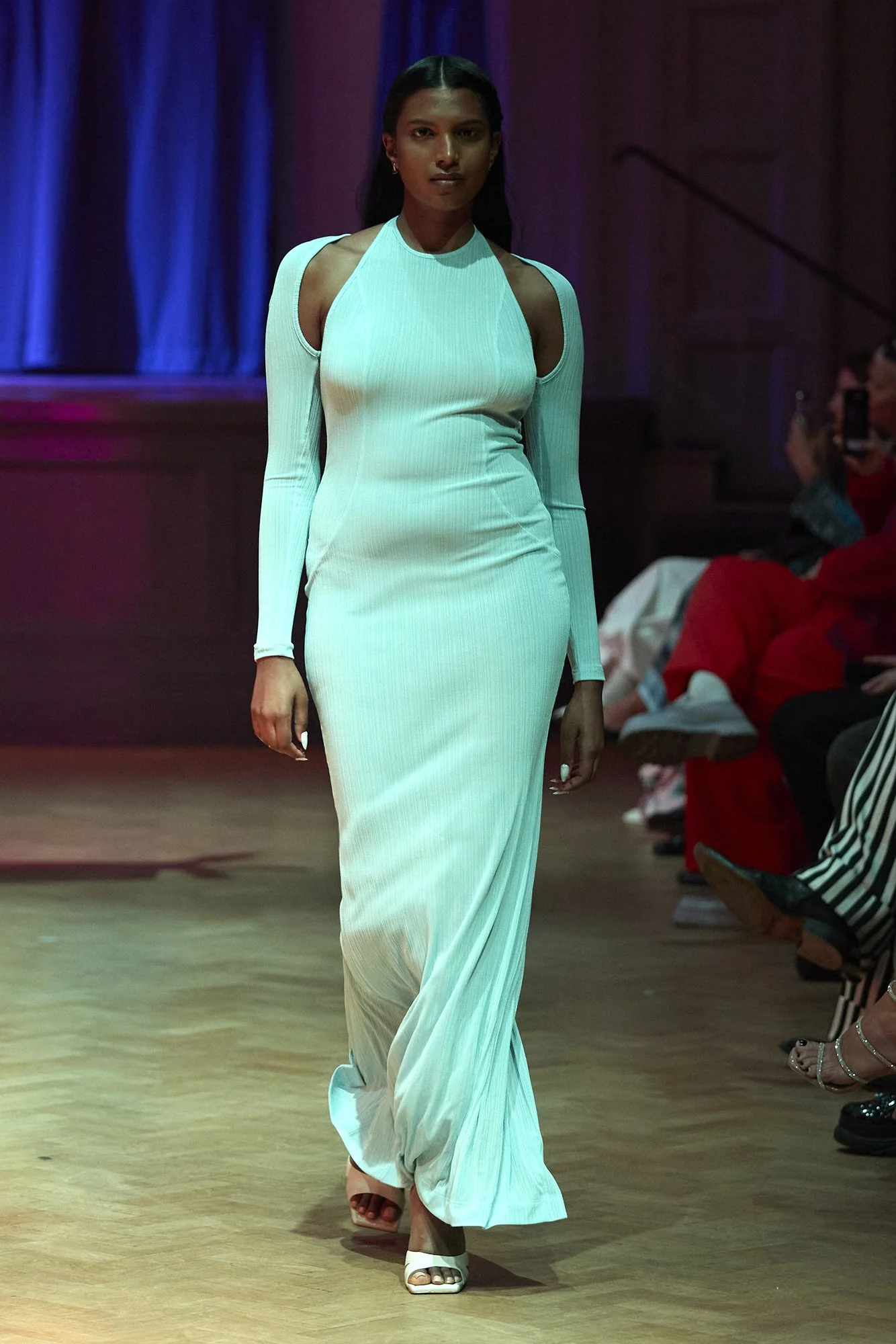 There were quieter interludes: a simple form-fitting maxiskirt here, a graphic T-shirt there. These looks were less showstopping, yet essential in balancing the more ambitious pieces. Overall, Ray Chu’s SS26 kept the momentum from his previous London Fashion Week seasons, where he consistently wove sustainability, body positivity and clever material choices into bold narratives. The fusion of adornment and cut; the poetic hooded forms and golden details; the tension between ready-to-wear and statement piece. This is a designer continuing to stretch boundaries without losing coherence.