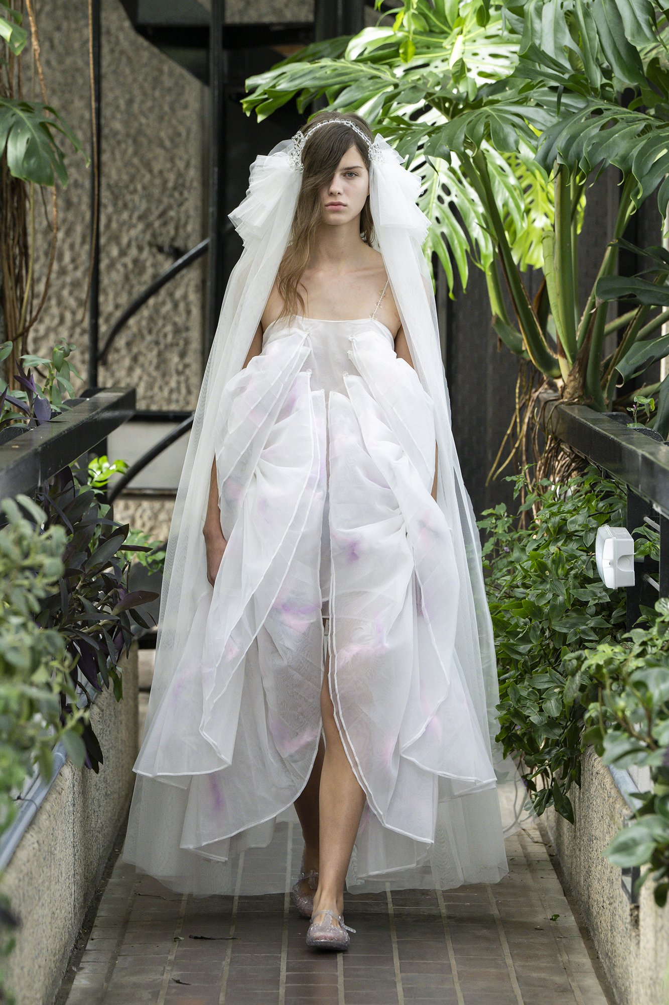 Fantasy bridal elements showcase Susan's signature “air-flower" technique made with Susan’s mom, where strips of layered tulle printed fabrics are pleated to create voluminous flowers. Built row by row directly on the mannequin, these air-flowers bloom in soft, lively colors as different prints layer together. Hand-beaded transparent Bubble beads float alongside laser-cut flower petals, creating a shimmer of flowers that seem to surround and protect the body. Real crystals serve as monogram and clover buttons, while hand-crochet elements bloom as transparent flowers across knitwear, adding nostalgic warmth and tactile richness to the collection's futuristic vision.