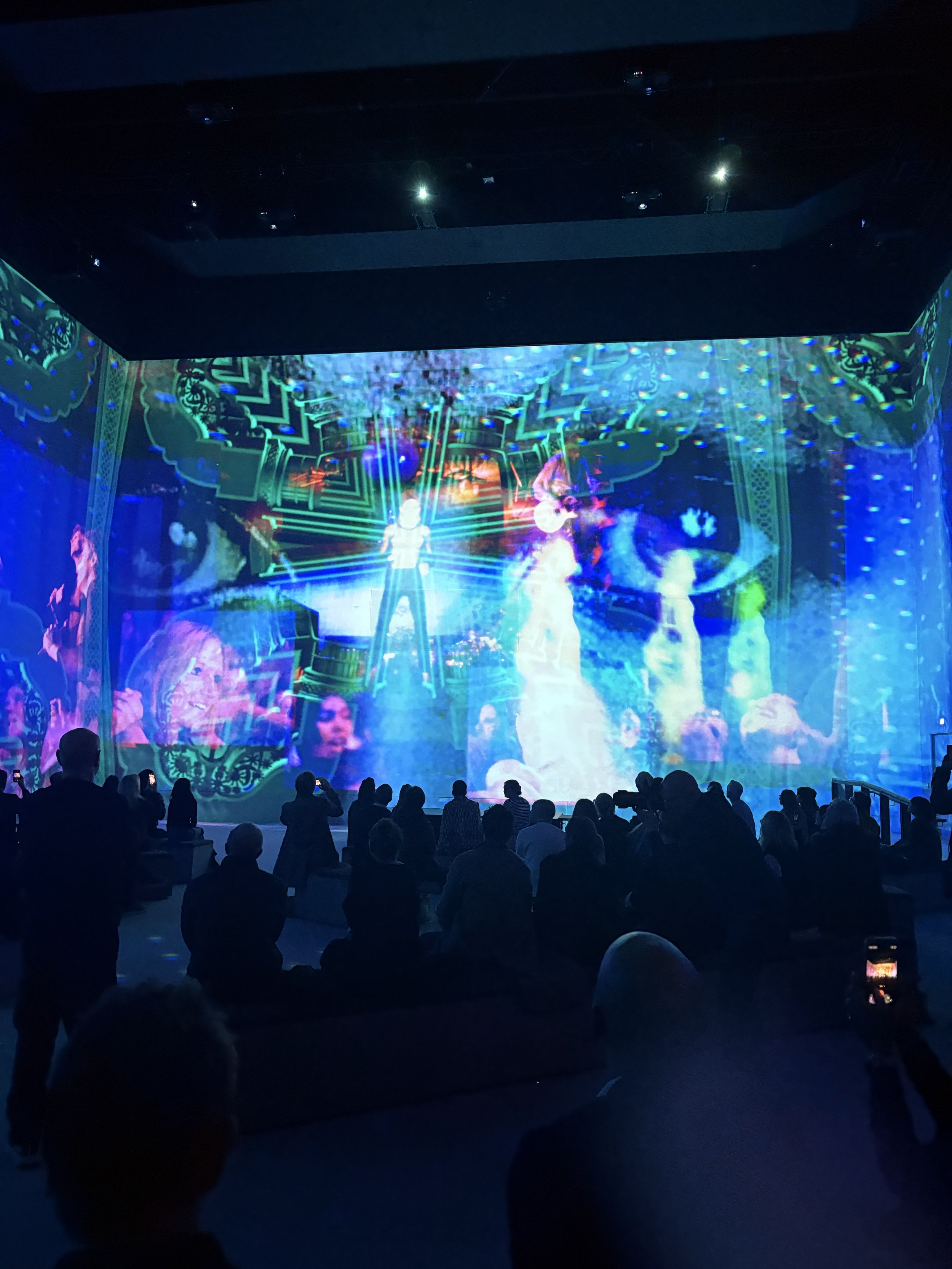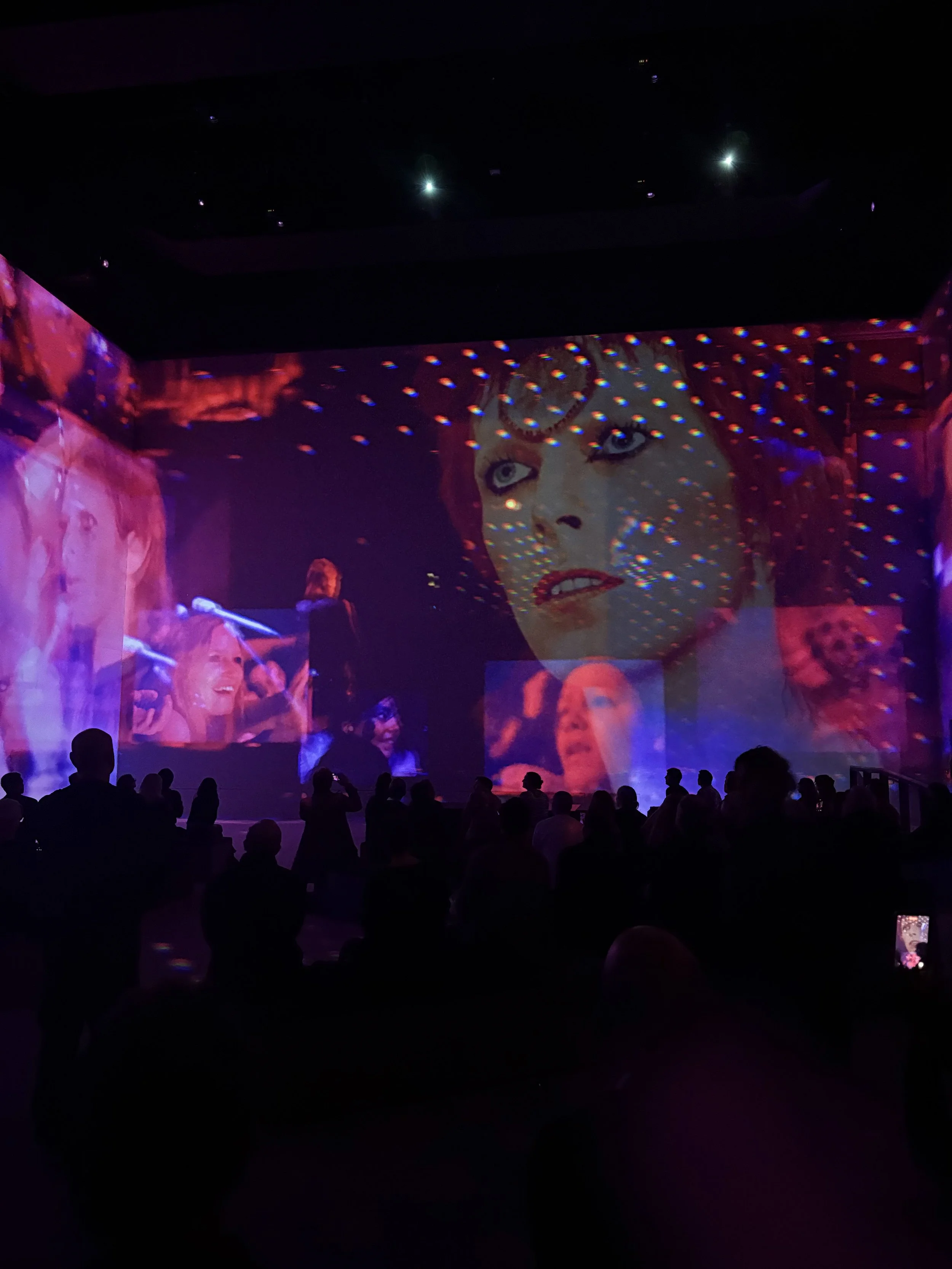 The room is enveloped in a hypnotic hue of red and blue that overlap and spin dizzily around the audience. The sound of ‘rock ‘n’ roll suicide’ swells through the space.