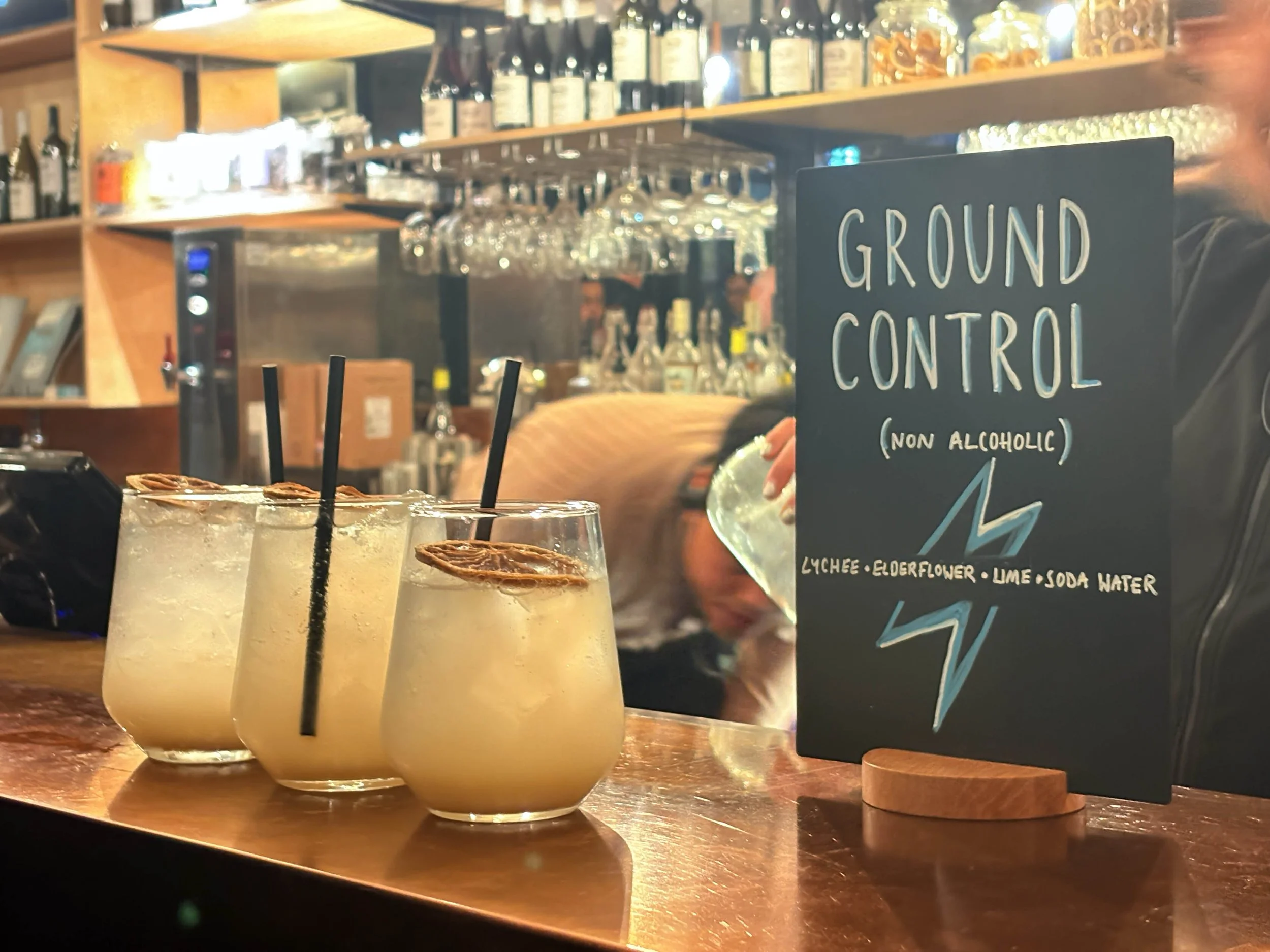 In an attempt to acclimate, I made my way to the bar where I spied, rather sweetly, Bowie-inspired drinks. My hand wavered toward one, a small, heavy-based Allegro glass topped up with a pale gradient of peach liquid. Accompanying it was a small chalkboard sign that read “Ground Control (non-alcoholic)”, the latter part of the sentence I had initially failed to see. So while the offering of lychee, elderflower, lime and soda seemed pleasant enough, after my less-than-stellar entrée, it felt just slightly insignificant. I stood singularly and silently in a crowd of chattering and giggling, still half soaked, so non-alcoholic, with little to be desired. I followed the direction of the staff, left across the bar to a highball glass and a sign that read “Major Tom Collin” Thankfully, the little phrase was omitted. Gin seemed good. Sophisticated even.
