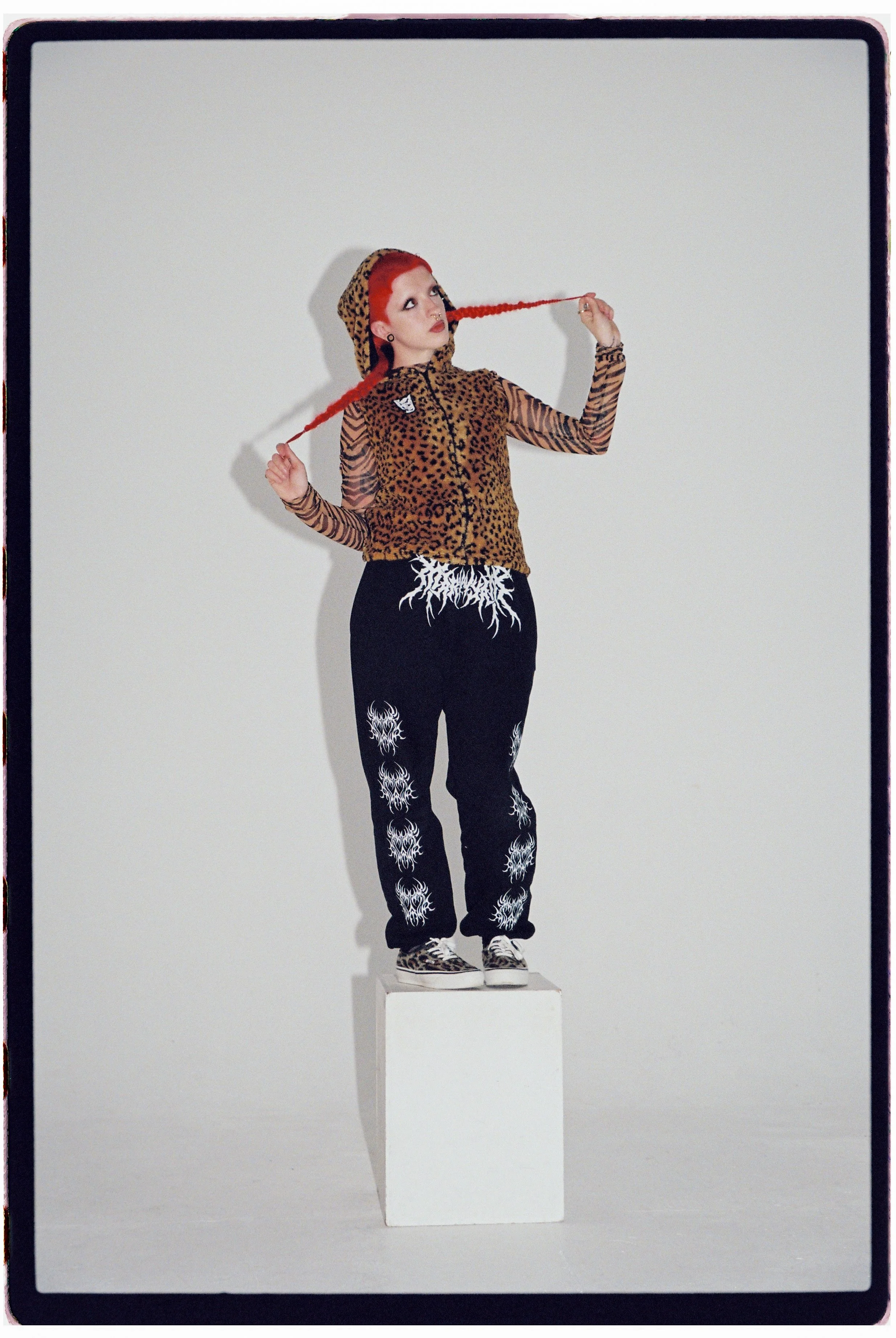 Leopard print hooded gilet: Empty Brains @emptybrains_ | Tiger print mesh: Urban Outfitters @urbanoutfitterseu | Tracksuit bottoms: Named Collective @named collective | Shoes: Vans @vans @vans_london